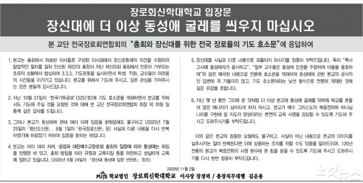 앞서 전국장로연합회는 교단지에 전임 총장이 동성애를 옹호해 연임 인준이 부결됐다는 내용으로 호소문을 발표했다.