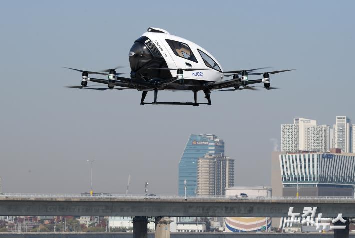 11일 오전 서울 여의도 한강시민공원에서 드론택시가 7분간 시범비행을 하고 있다. 이번 시험 비행에는 2명이 탑승할 수 있는 유인 드론 1대가 투입됐다. 해발 50m 상공에서 여의도 한강공원부터 서강대교, 밤섬, 마포대교 일대 1.8㎞를 두 바퀴(총 3.6㎞) 약 7분간 비행했다. 비행에 투입된 기체는 중국 이항(EHANG)사에서 제작한 기체(EH216)다. 최고 3000m 높이에서 최대 130㎞의 속력을 낼 수 있다.