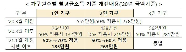 이에 따라 1인가구는 내년 1월부터 가구원수별 월평균소득 기준이 도시근로자 월평균소득의 70%를, 2인가구는 60%를 적용받는다.