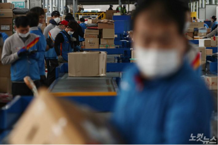 지난달 21일 오전 서울 서초구 CJ대한통운 택배물류현장에서 택배노동자들이 택배 분류 작업을 하고 있다.(사진=윤창원 기자/자료사진)