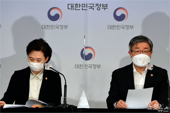 이재갑 고용노둥부 장관(오른쪽)과 김현미 국토교통부 장관이 12일 오후 정부서울청사 합동브리핑실에서 ‘택배기사 과로 방지 대책’ 을 발표하고 있다. 정부는 택배기사의 주 5일제 도입 등 작업환경 개선을 위한 사회적 논의를 시작하고 불공정 행위를 파악하기 위해 올해 말까지 특별제보 기간도 운영하기로 했다고 밝혔다. (사진=황진환 기자)