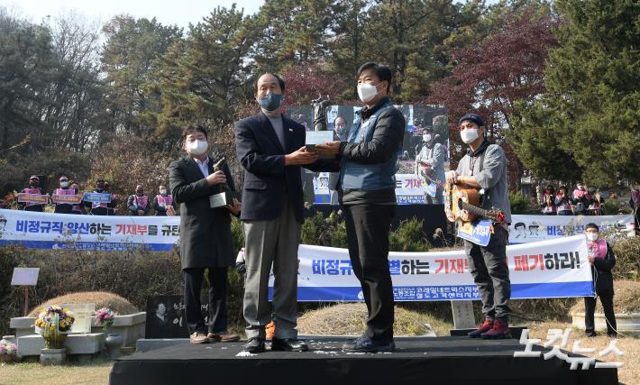 13일 경기도 남양주시 모란공원에서 열린 전태일 열사 50주기 추도식에서 택배연대 노조 김태완 위원장이 전태일노동상 수상을 하고 있다.