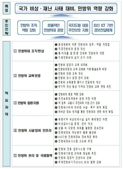 제도개선 5대 분야는 민방위대 조직‧편성, 민방위 교육‧운영, 민방위 동원‧지원, 민방위 시설‧장비 인프라, 민방위 관리 및 국제협력 등이다.