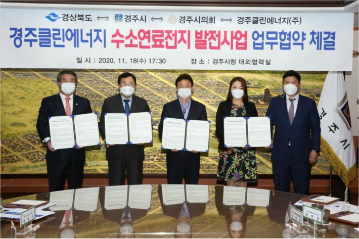 시는 지난 18일 시청 대외협력실에서 이철우 경북지사와 주낙영 경주시장, 서호대 시의회 의장, 임민규 경주클린에너지(주) 대표이사 등 20여 명이 참석한 가운데 '경주클린에너지 수소연료전지 발전소'의 성공적 투자를 위한 업무협약을 체결했다.