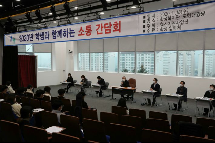 간담회는 학생들과의 소통을 통해 대학의 혁신적 학풍을 조성하고 학생 중심의 교육을 실현하기 위해 마련했다. 학업과 교육환경 등 학사 운영 전반에 대한 의견과 건의사항을 듣고 반영 여부도 현장에서 제시하는 등 활발한 대화 분위기로 진행했다.