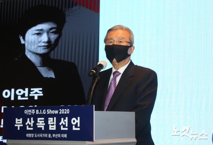 국민의 힘 김종인 비대위원장이 23일 오후 서울 여의도의 한 호텔에서 열린 이언주 전(前) 의원의 '부산독립선언'출판기념회에 참석해 축사를 하고 있다.
