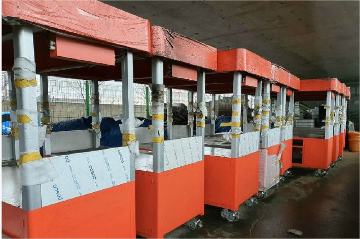 부산 동구 범일동의 한 고가도로 하부 공터. 전통시장에서나 볼 수 있을법한 이동형 매대 수십 개가 파란색 천막에 둘러싸여 있었다. 일부 매대에 상호가 적혀 있는 것을 제외하면, 대부분 매대는 별다른 흠집을 찾기 힘들 정도로 상태가 양호했다.