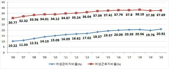 2006년~2020년 여성 노동자 비율 및 관리자 비율 변화 추이. (사진=고용노동부 제공)