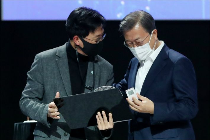 문재인 대통령이 25일 오후 경기 고양시 일산 킨텍스에서 열린 '한국판 뉴딜 대한민국 인공지능을 만나다' 행사에서 김윤 SKT 부사장으로부터 국내 최초 개발한 인공지능 반도체를 전달받고 있다. (사진=연합뉴스)