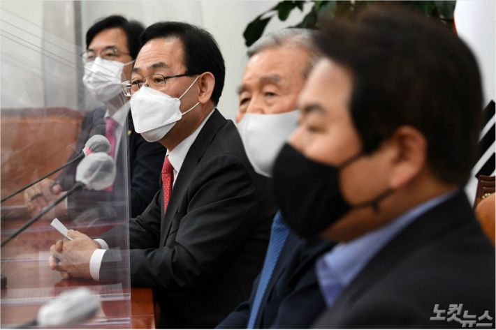 국민의힘 주호영 원내대표가 25일 오후 서울 여의도 국회에서 긴급기자회견을 열고 추미애 법무부 장관의 윤석열 검찰총장에 대한 징계 청구와 관련한 입장을 발표한 뒤 질의응답을 하고 있다. 윤창원기자