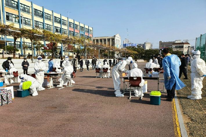 광주 서구 보건소 관계자들이 26일 광주 서구 화정동 서석중학교에서 학생과 교직원을 대상으로 코로나19 검사를 진행하고 있다. (사진=광주 서구청 제공)