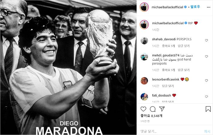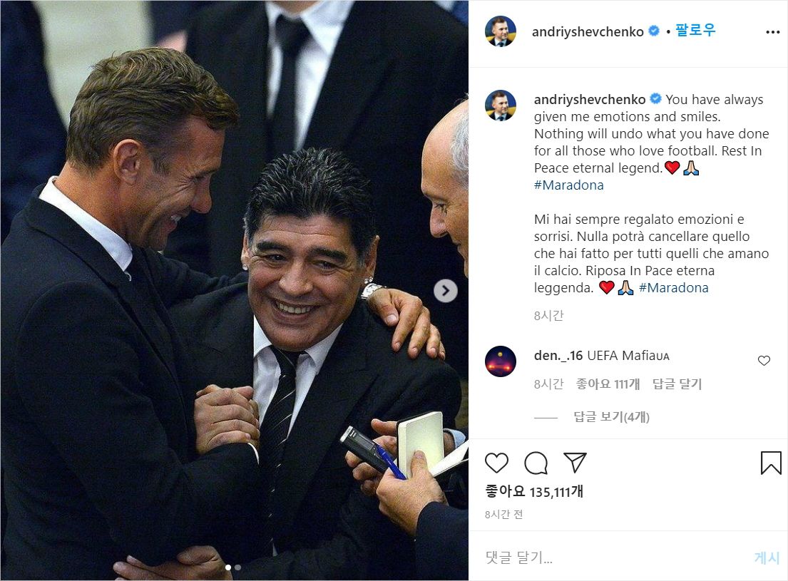 네이마르(28·브라질), 즐라탄 이브라히모비치(39·스웨덴), 미하엘 발락(44·독일), 안드리 세브첸코(44·우크라이나) 등 자국에서 2000년대 대표팀을 이끌었던 축구 스타들은 SNS에 사진과 글을 남기며 고인이 된 마라도나를 기렸다.