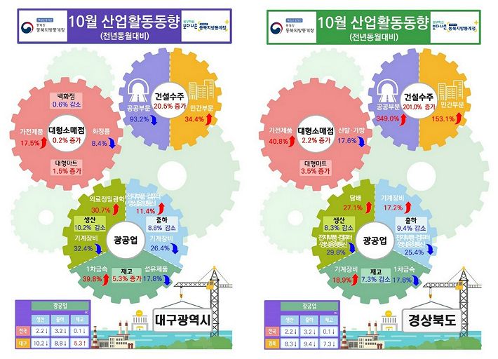 동북지방통계청이 30일 발표한 '10월 대구·경북 산업활동동향'을 보면 대구지역의 광공업 생산은 전월 대비 3.0%가 증가했지만 지난해 같은 기간과 비교해서는 10.2%가 감소했다.