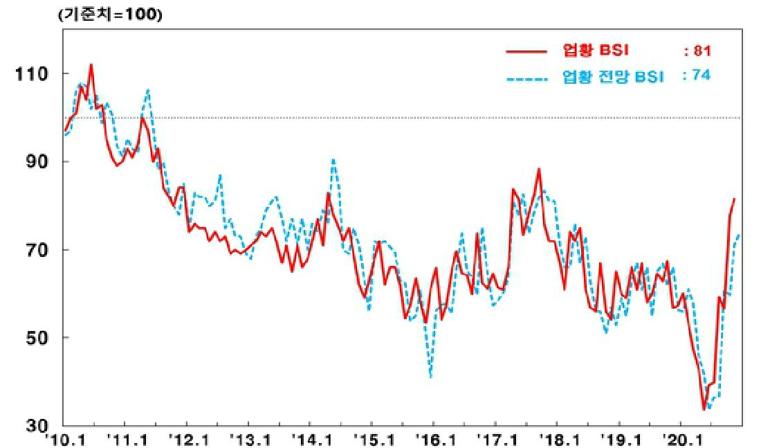 한국은행 대구·경북본부는 11월 대구경북지역 기업경기를 조사한 결과, 제조업의 업황BSI(기업경기실사지수)는 81로 전월 대비 3p(대구 1p, 경북 4p) 상승했다고 2일 밝혔다.