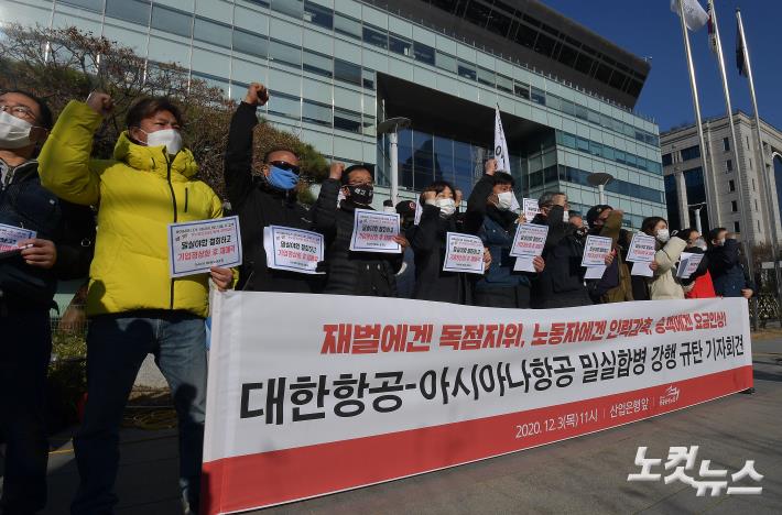 민주노총 공공운수노조 소속 아시아나항공 노조와 대한항공직원연대지부, 참여연대 등이 3일 서울 영등포구 여의도 산업은행 앞에서 대한항공·아시아나항공 밀실합병 강행 규탄 기자회견을 하고 있다.