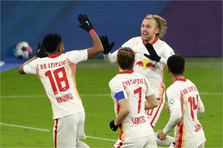 득점 후 기뻐하는 라이프치히 선수들 (사진=연합뉴스)