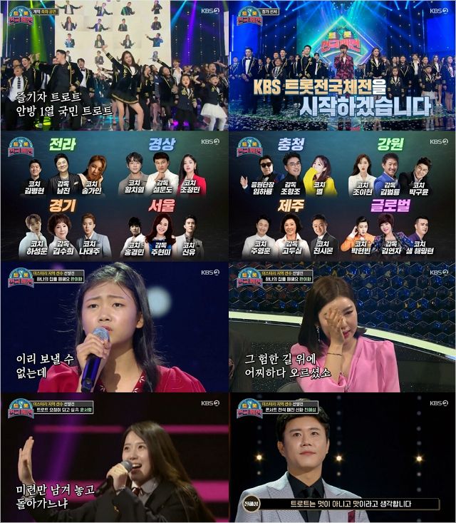 지난 5일 KBS2 '트롯 전국체전'은 160분 특별 편성으로 포문을 열었다. 이날 방송에서는 MC 윤도현의 활기찬 인사와 함께 사물놀이, 네온 마임, 치어리딩, 아카펠라 등 다채로운 매력의 공연과 남진, 설운도, 김수희, 주현미, 조항조, 김범룡, 고두심, 김연자 등 각 지역 대표 감독의 무대가 펼쳐졌다.