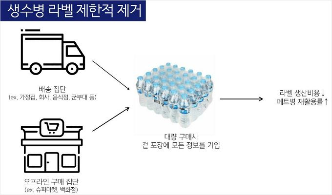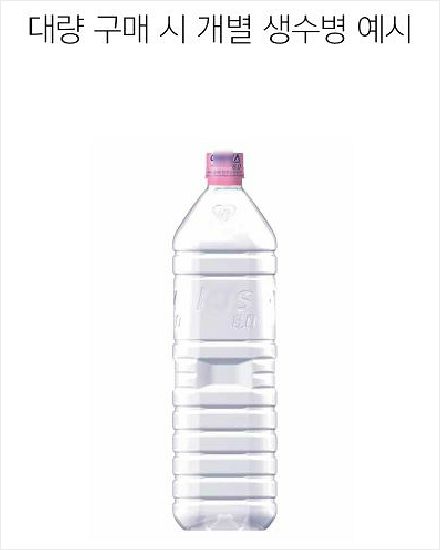 ◆한우석> 생수병 같은 경우에는 대부분 가정에서 구독을 통해 배송해 마시는 집단이 많기 때문에 라벨이 별로 필요가 없겠구나. 라벨을 뗀 상태의 무라벨 생수병을 공급하자는 안건을 제안하게 되었습니다. 슈퍼마켓이나 대형마트 같은 경우에 개별구매를 할 시에는 라벨이 필요하겠지만, 16개 정도 대량구매를 할 시에는 겉 포장에 흰색깔 비닐이 감싸져 있지 않습니까? 그런 겉포장 비닐에도 겉포장 비닐에만 생수병을 알아볼 수 있는 브랜드나 영양성분등을 적어 놓고 안쪽에는 무라벨 생수병을 공급하는 식으로. 그렇게 두 가지 경로를 생각했습니다.