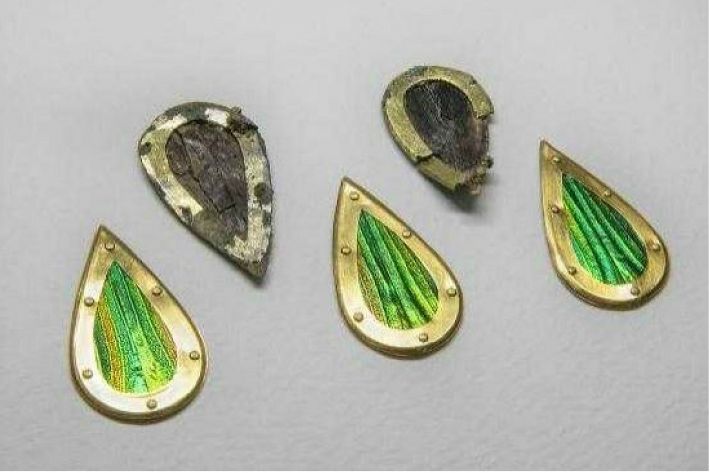 출토된 비단벌레 날개장식. 원 출토품의 재현품(아래)과 함께 찍었다(사진=문화재청 국립경주문화재연구소 제공)