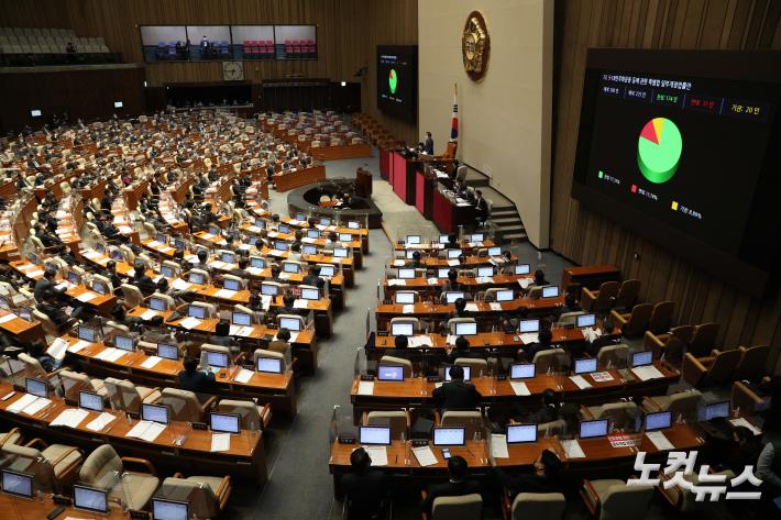 9일 오후 서울 여의도 국회에서 열린 본회의에서 5·18민주화운동 등에 관한 특별법 개정안이 통과되고 있다.