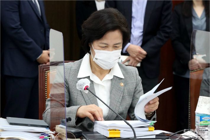 지난달 18일 오후 국회에서 열린 공수처장 후보 추천위원회 3차회의에 참석한 추미애 법무부장관이 회의 자료를 검토하고 있다.(사진=윤창원 기자/자료사진)