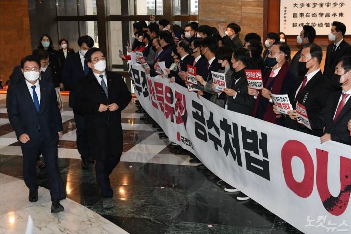 국민의힘 의원들이 지난 9일 국회 본회의장 입구에서 공수처법 개정안 처리 등을 위해 본회의에 참석하는 여당 의원들을 향해 공수처법 저지 등이 적힌 손팻말을 들어보이고 있다. (사진=윤창원 기자)