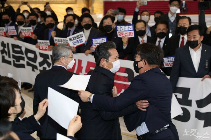 이날 본회의 전후 로텐더 홀 인근에선 여야 의원들 사이에 충돌도 발생했다. 국민의힘 의원들이 본회의장 앞에서 피켓 시위를 하고 있던 도중 회의장으로 입장하던 민주당 정청래 의원과 실랑이를 벌인 것이다.
