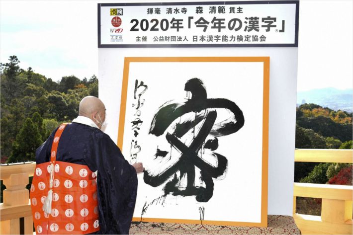 일본 교토의 사찰 기요미즈테라에서 이 사찰의 주지 스님이 14일 휘호를 통해 올해의 한자 '密(빽빽할 밀)'을 발표하는 모습.(사진=연합뉴스)