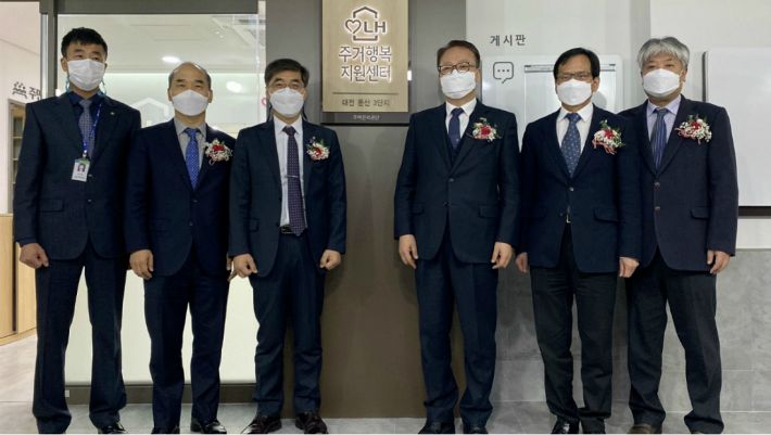 지난 15일 개최된 대전둔산3 LH주거행복지원센터 개소식에서 관계자들이 기념사진을 촬영하고 있다. (사진=LH 제공)