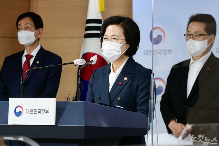추미애(가운데) 법무부 장관이 16일 서울 종로구 정부서울청사 합동브리핑실에서 박지원(오른쪽) 국가정보원장과 진영 행정안전부 장관과 권력기관 개혁 관련 언론 브리핑을 하고 있다.(사진=사진공동취재단)
