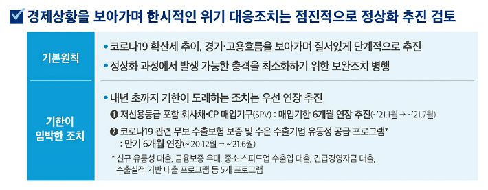 한편, 은행권과 정책금융 대출 만기 연장과 이자 상환 유예 등 시한부 코로나 위기 대응 조치는 경제 상황에 따라 점진적으로 정상화 즉, 원상회복될 전망이다.