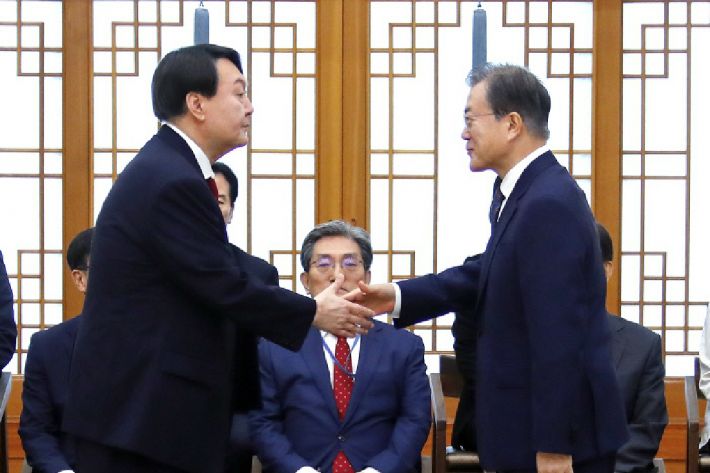문재인 대통령이윤석열 검찰총장에게 임명장을 수여한 뒤 악수하고 있다. (사진=연합뉴스/자료사진)