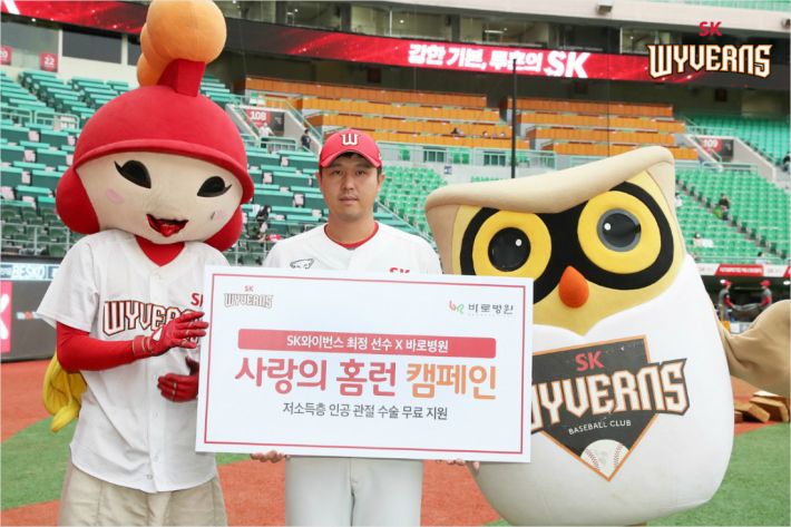 최정의 홈런 1개당, 인천지역 소외계층 1명에게 인공관절 수술 본인부담비용을 지원하는 이 캠페인은 지난 2012년부터 SK 구단과 국제바로병원이 공동으로 진행하고 있다.
