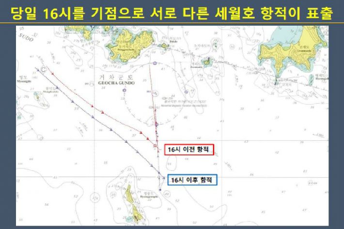 하지만 이날 오후 4시 해수부가 최초로 발표한 세월호 항적은 이와는 전혀 달랐다. 방향은 일치했지만, 상황실에 떠 있던 궤적보다 한참 아래쪽으로 이동했고 꺾인 지점도 병풍도에서 더 가까워졌다. 당시 세월호의 실시간 항적은 사고 원인 조사는 물론 빠른 인명 구조를 위해서도 매우 중요한 정보였다.
