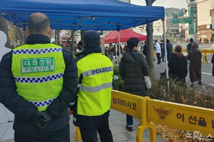 서울 종로경찰서 소속 대화경찰이 지난달 21일 서울 지하철 3호선 경복궁역 인근 도로에서 집회를 통제하고 있다.(사진=김태헌 기자)