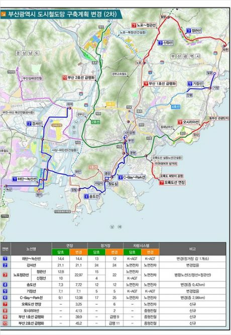 10개 노선은 하단녹산선, 강서선, 송도선, 시베이 파크선, 오륙도선 연장, 오시리아선, 기장선, 노포정관선, 1·2 호선 급행 등이다.