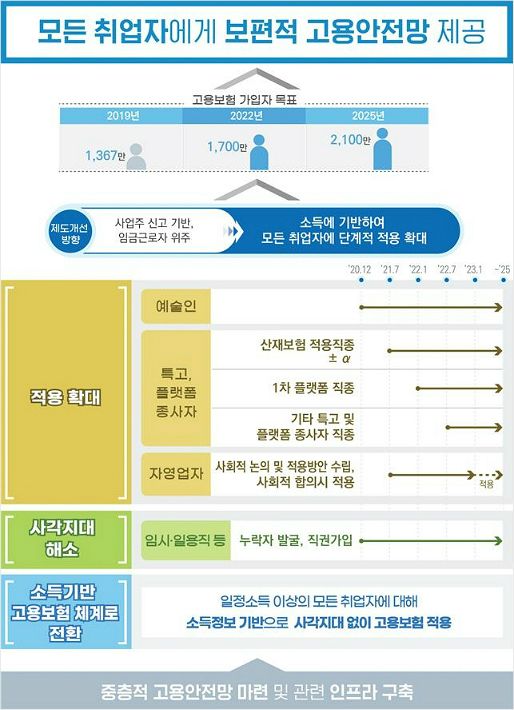 고용노동부는 각 대상별로 고용보험을 확대하고, 소득기반으로 고용보험 체계를 전환하기 위한 '전국민 고용보험 로드맵'을 23일 발표했다.