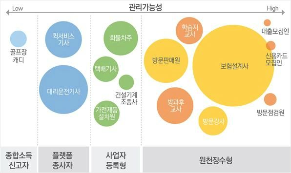 예를 들어 소득신고 유형에 따라 △사업주가 매월 소득세를 원천징수하는 보험설계사, 대출·카드모집인, 방판원, 학습지·방문교사, 대여제품점검원 등 '원천징수형' △사업주의 원천징수 없이 본인이 부가가치세 신고를 하는 건설기계종사자, 화물차주, 택배기사, 가전제품설치기사 등 '사업자 등록형' △사업자가 아니면서 인적용역의 대가를 지급받는 퀵서비스 기사, 대리운전기사, 골프장캐디 등 '종합소득신고자'로 나누어 접근하는 식이다.