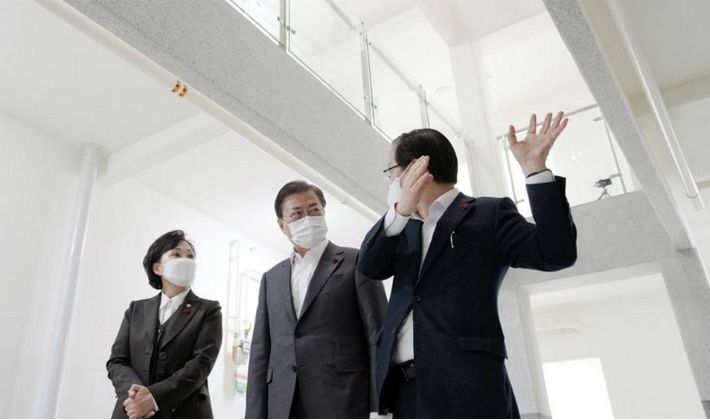 문재인 대통령이 지난 11일 오전 경기 화성시 LH 임대주택 100만호 기념단지인 동탄 공공임대주택에서 김현미 국토교통부 장관(왼쪽), 변창흠 국토교통부 장관 후보자와 함께 '살고 싶은 임대주택' 현장점검을 하고 있다.(사진=연합뉴스)