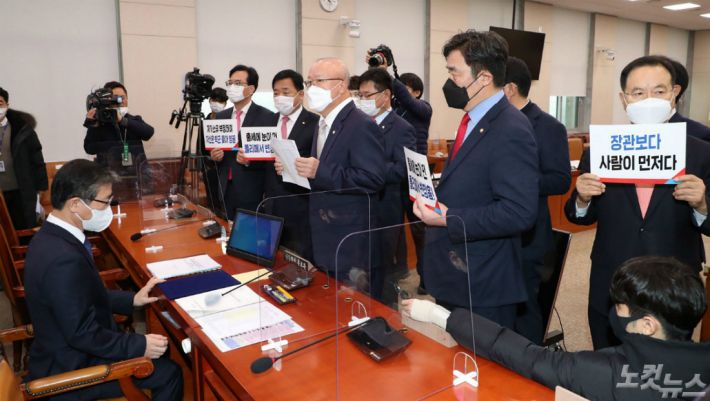 지난 23일 오전 국회에서 열린 변창흠 국토교통부 장관 후보자에 대한 인사청문회에서 국민의힘 의원들이 변 후보자에게 피켓을 들고 항의하고 있다.(사진=윤창원 기자)