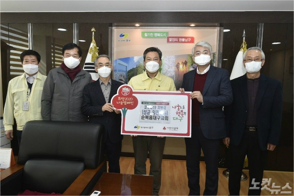 순복음대구교회가 지난 2월 코로나19 극복을 위한 성금 천만원을 남구보건소에 후원했다. 우측 두번째는 순복음대구교회 이건호 담임목사. (사진=순복음대구교회 제공)