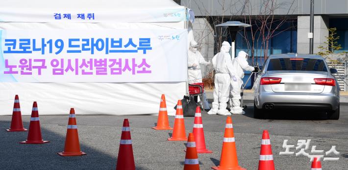 27일 오전 서울 노원구 서울과학기술대학교 체육관 앞에 설치된 '드라이브 스루' 방식의 임시 선별검사소에서 시민들이 코로나19 검사를 받고 있다. 중앙방역대책본부는 27일 0시 기준 코로나19 신규 확진자가 970명 발생했다고 밝혔다.