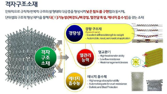 격자구조소재는 특정형상의 단위셀이 규칙적으로 배열돼 인위적인 다공구조를 형성시킨다. 단위셀의 소재와 형상, 크기, 배열의 설계를 통해 기계적, 열적 특성을 제어할 수 있다. 경량성과 에너지흡수성, 열전달 특성이 우수해 2개 이상의 기능을 동시에 갖춘 다기능 소재로 응용분야에 최적화된 맞춤형 설계가 가능하다. 또, 개방형태의 격자구조는 표면적이 넓고 내부유동이 균일하여 전열특성이 우수하고 압력손실이 작아 열교환기, 히트싱크 등 다양한 열에너지 관리 장치에 활용 가능하다. 하지만, 미국․영국 등 일부 기술선진국에서 방위산업분야를 제외하고는 민간분야에서 산업화가 쉽게 이루어지지 않고 있는데, 복잡한 내부 형상으로 인한 제조공정 비용의 증가가 가장 큰 원인으로 지목되고 있다.