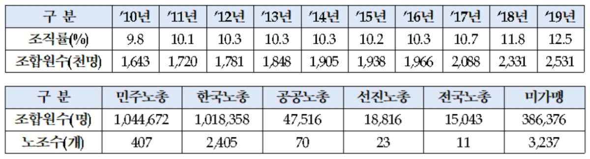 한편, 2019년은 민주노총과 한국노총 모두 조합원 수가 100만 명을 돌파한 해로 기록했다.