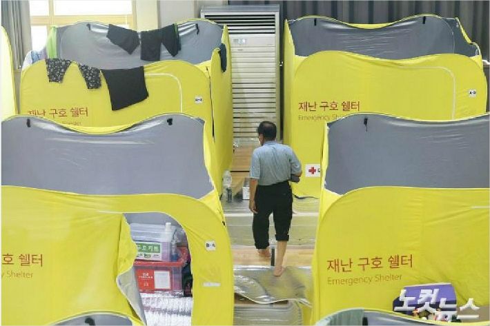 8월 12일 전북 남원시 금지면 금지문화누리센터에 마련된 대피소에서 주택 침수로 보금자리를 잃은 이재민들의 모습./사진=이한형 기자