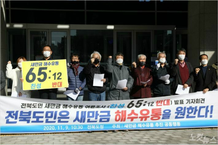 새만금 해수유통 추진 공동행동은 11월 9일 전북도청 앞에서 기자회견을 열고, 새만금호 해수유통에 대한 도민 설문조사 결과를 발표했다./사진= 정희원 인턴
