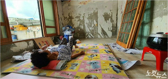 9월 3일 오후 전북 남원시 금지면 하도마을, 조봉금(70)씨가 시멘트 바닥 위에 신문지와 매트리스를 깔고 누워 있는 모습./사진=남승현 기자
