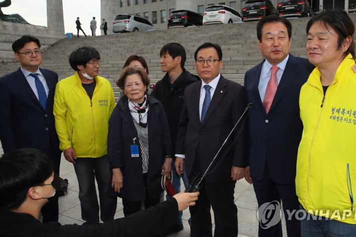 '진실ㆍ화해를 위한 과거사정리 기본법 일부개정법률안(대안)'이 국회 본회의를 통과한 지난 5월 20일 국회 본관 앞에서 형제복지원피해자인 최승우 씨(오른쪽), 한종선 생존자대표와 김무성, 이채익, 진선미, 홍익표 의원 등이 기자회견하고 있다. (사진=연합뉴스)