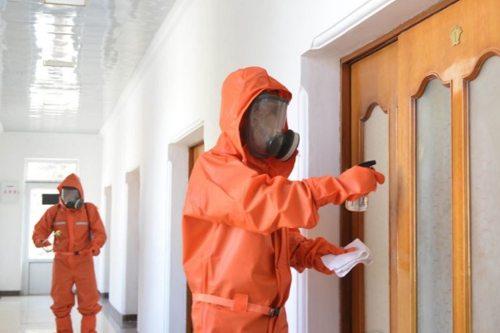 북한 단천시 대중시설에서 신종 코로나바이러스 감염증 예방을 위해 방역작업을 하는 모습. 연합뉴스