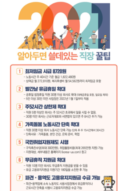 이와 함께 직장갑질119는 올해 바뀌는 노동관련 제도 중 '알아두면 도움 되는 직장 꿀팁'을 공개했다. △최저임금 시급 8720원(월 182만2480원, 209시간 기준·주휴수당 포함) △빨간날 유급휴일 확대(30인 이상) △주52시간 상한제 확대 △가족돌봄 노동시간 단축 확대 △국민취업지원제도(구직촉진수당 최대 300만원 등) △10인 미만 무급휴직 지원금 지원 △파견·용역 고용유지지원금 수급 등이다.